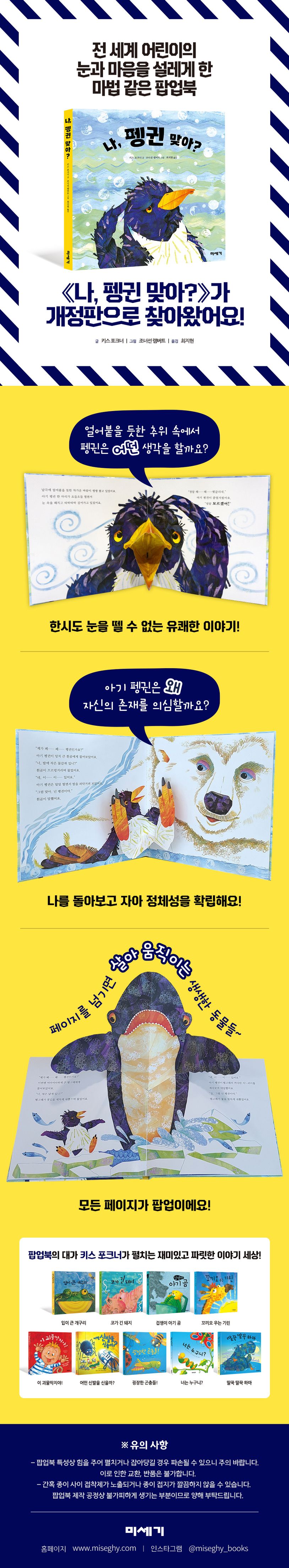 베스트셀러 팝업북 《입이 큰 개구리》의 키스 포크너와 조너선 램버트 작가가 다시 함께한 작품입니다. 어린이의 모습을 쏙 빼닮은 《입이 큰 개구리》의 개구리만큼 사랑스러운 아기 펭귄과 시원시원한 팝업의 《나, 펭귄 맞아?》를 개정판으로 만나 보세요.