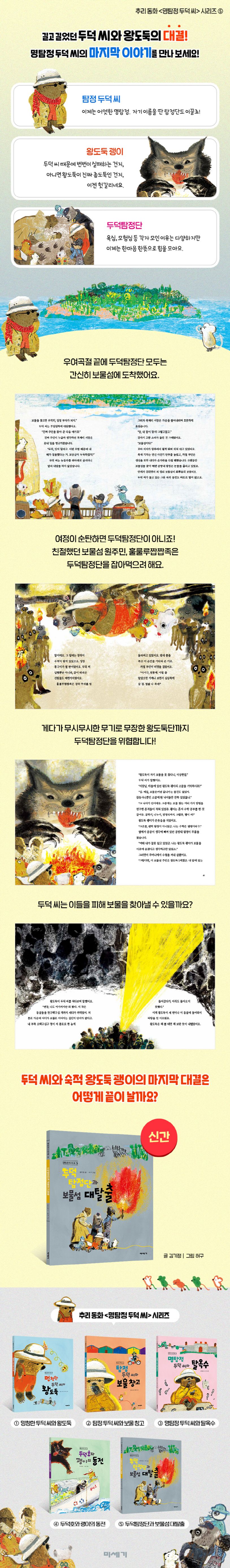 명탐정 두덕 씨는 이들을 피해 보물을 찾아낼 수 있을까요? 또 두덕탐정단은 모두 무사히 집으로 돌아갈 수 있을까요? 길고 길었던 두덕 씨와 왕도둑의 마지막 대결에 꼭 함께하세요!