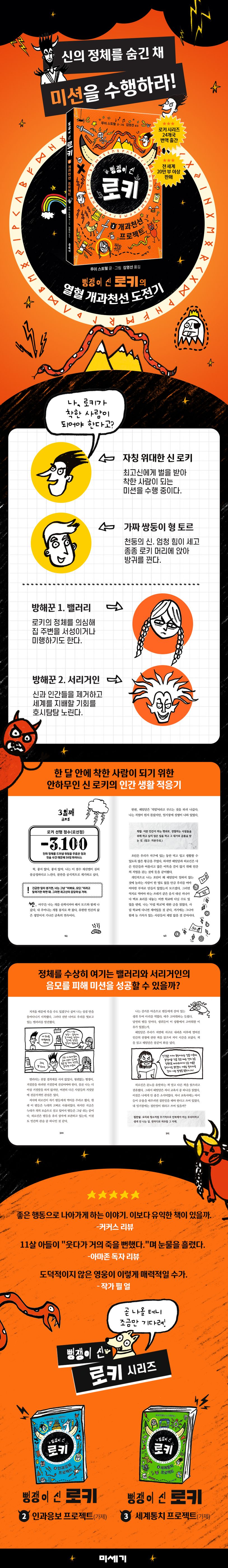 로키가 쓰는 마법의 일기장을 독자들이 엿보는 이야기 구성에 낙서와 만화가 어우러진 흡입력 넘치는 챕터북이다. 세계에서 20만 부 이상 판매된 책으로, 세계의 어린이 독자들이 느낀 재미가 한국 어린이 독자들에게도 전해지길 기대한다. 사고뭉치 신 로키가 개과천선하여 착해질 수 있을지, 그리고 신이 되어 돌아갈 수 있는지, 매일 어디로 튈지 알 수 없는 뻥쟁이 신 로키의 통쾌하고 아슬아슬한 인간 생활 적응기를 만나 보자.
