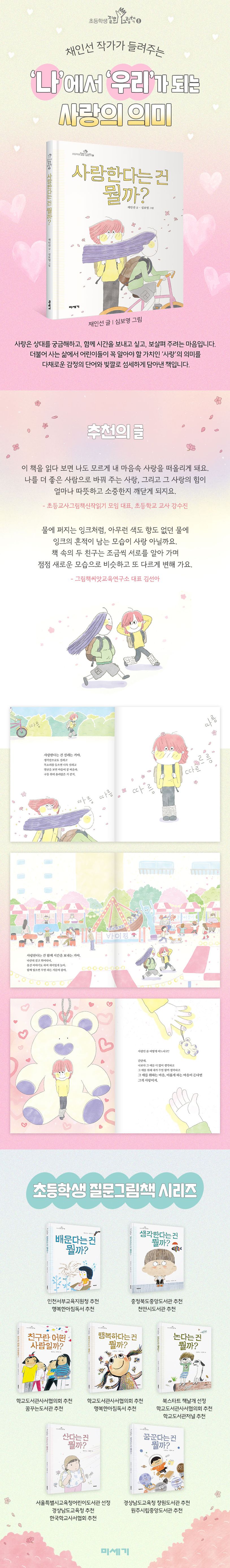아이들을 위한 인문 그림책 시리즈, ‘초등학생 질문 그림책’의 여덟 번째 책. 사랑은 배려, 존중, 책임 등 사람들이 가져야 할 덕목과 가족, 친구, 이웃과 같이 인간관계에서 바탕이 되는 감정이다. 우리에게 가장 익숙하고 가깝지만, 사랑이 무엇인지 묻는다면 쉽게 답하기가 어렵다.