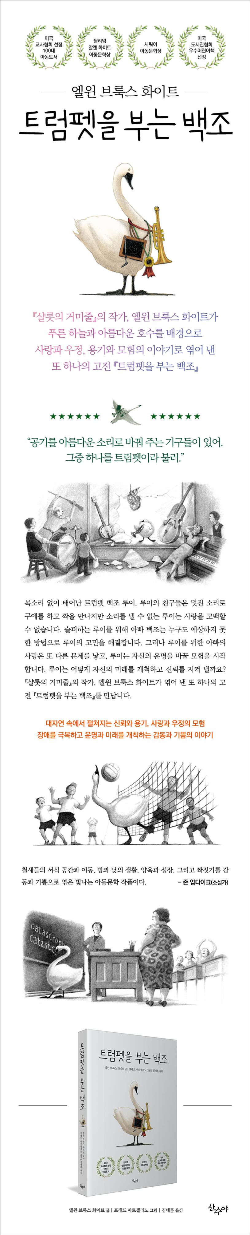 『샬롯의 거미줄』의 작가, 엘윈 브룩스 화이트가 푸른 하늘과 아름다운 자연에서 신뢰와 용기, 사랑과 우정의 이야기로 엮어 낸 또 하나의 고전 『트럼펫을 부는 백조』
