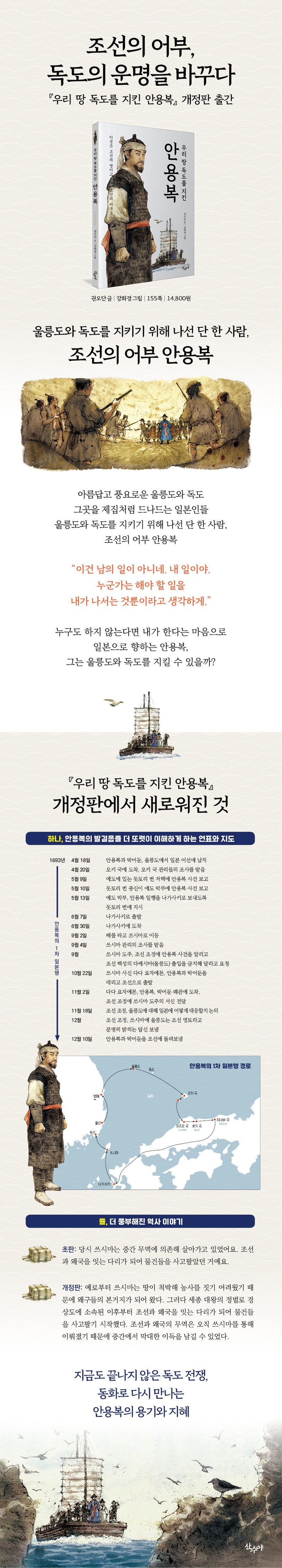 이번 개정판에서는 어린이 독자들의 이해를 도울 수 있도록 몇 가지를 더했다. 두 차례의 일본행 당시 안용복의 행적과 그와 관련된 역사적 사건을 정리한 연대표, 안용복의 이동 경로를 그린 지도를 본문 앞에 넣었고, 본문에서도 각주들을 추가했다. 안용복이 어떤 사람이었고 어떻게 울릉도와 독도를 지켜 냈는지 알고 싶은 독자들에게 도움이 될 것이다.