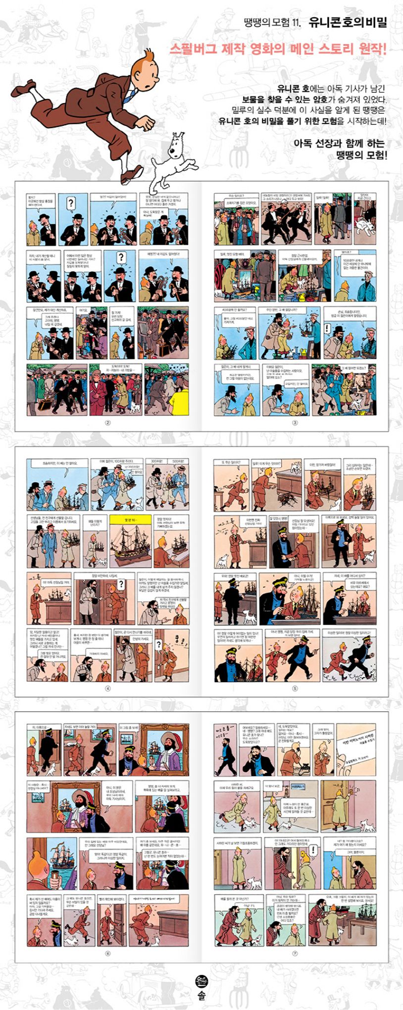 「TinTin 땡땡의 모험」제11권『유니콘호의 비밀』. 호기심 많고 모험심 강하며 재치 넘치는 소년 기자 땡땡이 전 세계를 돌아다니며 갖가지 사건을 해결하는 과정을 담고 있습니다. 동양과 서양은 물론 아프리카와 사막, 극지방, 바닷속, 달나라 그리고 실다비아나 보르두리아 같은 상상의 공간까지 아우르는 땡땡의 모험 이야기 24권은 ‘세계 역사와 문화의 백과사전’이라 불릴 만큼 그 내용이 알차고 풍부한 것으로 유명합니다. 특히 유럽 가정의 과반수가 이 책을 즐겨 읽고 있다는 사실에서 알 수 있듯이 어린이와 어른이 함께 읽는 가족 만화의 고전이며 걸작입니다.