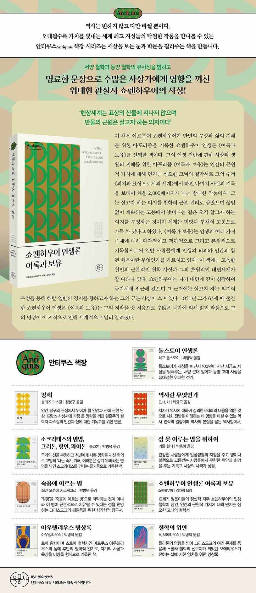 이 책은 쇼펜하우어가 만년의 수상(隨想)과 삶의 지혜를 위한 아포리즘을 기록한 쇼펜하우어 인생론 ≪여록(余錄)과 보유(補遺), Parerga und paralipomena≫를 선역(選譯)한 책이다.