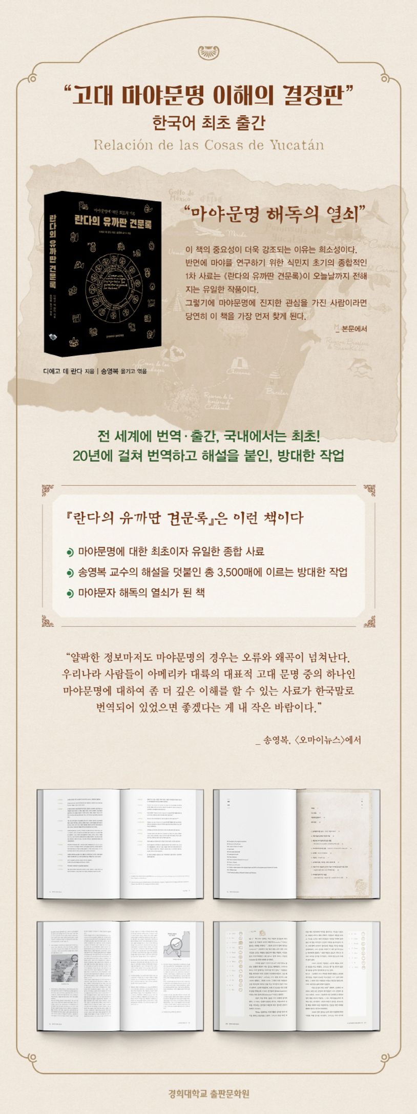 《란다의 유까딴 견문록(Relación de las cosas de Yucatán)》은 ????마야문명???? 하면 항상 따라붙는 가장 유명한 사료이다. 유럽이 아메리카 대륙을 침략하고 난 직후인 16세기, 가톨릭교회의 신부인 디에고 데 란다(Fray Diego de Landa)는 아메리카 대륙에 건너가 마야 원주민들에게 선교 사업을 펼쳤다. 그리고 마야문명 정복의 역사부터 주변의 지리, 마야인들의 정치, 사회, 문화, 종교, 성과 사랑, 인신공양 풍습, 건축, 문자, 음식, 의복, 환경 등 모든 것을 이 책에 담았다. 이 책은 유럽 열강이 초기 식민지를 개척하던 시대에 남겨진 마야문명에 관한 최초이자 유일한 종합 사료이며 마야인들의 삶에 관한 종합적인 보고서로, 한마디로 말하면 마야문명 종합 백과사전이다.