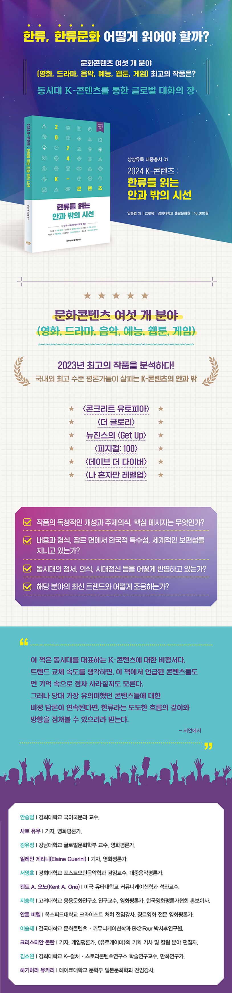 BTS에 이어 뉴진스 등 차세대 K-팝 주자들의 약진과 더불어 넷플릭스의 〈오징어게임〉, 〈더 글로리〉 같은 K-콘텐츠 열풍은 날로 거세지고 있다. 샤넬, 디올 등 유명 패션 브랜드는 물론이고 코카콜라의 한글 로고 사용, 맥도날드의 뉴진스 버거 출시 등 글로벌 기업들도 K-팝스타와 한류에 주목하고 있다. 한류 20년, 경희대학교 K-컬처ㆍ스토리콘텐츠연구소에서는 『2024 K-콘텐츠: 한류를 읽는 안과 밖의 시선』을 통해 한류 현상을 주도하는 K-콘텐츠를 대상으로, 작지만 흥미로운 ‘글로컬’ 담론장을 만들기로 했다. 우선 연구소 내에서 2023년 문화콘텐츠 여섯 개 분야(영화, 드라마, 음악, 예능, 웹툰, 게임)에서 〈콘크리트 유토피아〉(영화), 〈더 글로리〉(드라마), 뉴진스의 〈Get Up〉(K-팝), 〈피지컬: 100〉(예능), 〈데이브 더 다이버〉(게임), 〈나 혼자만 레벨업〉(웹툰)이라는 여섯 작품을 대표작품으로 선정해 다음과 같은 내용을 분석했다.