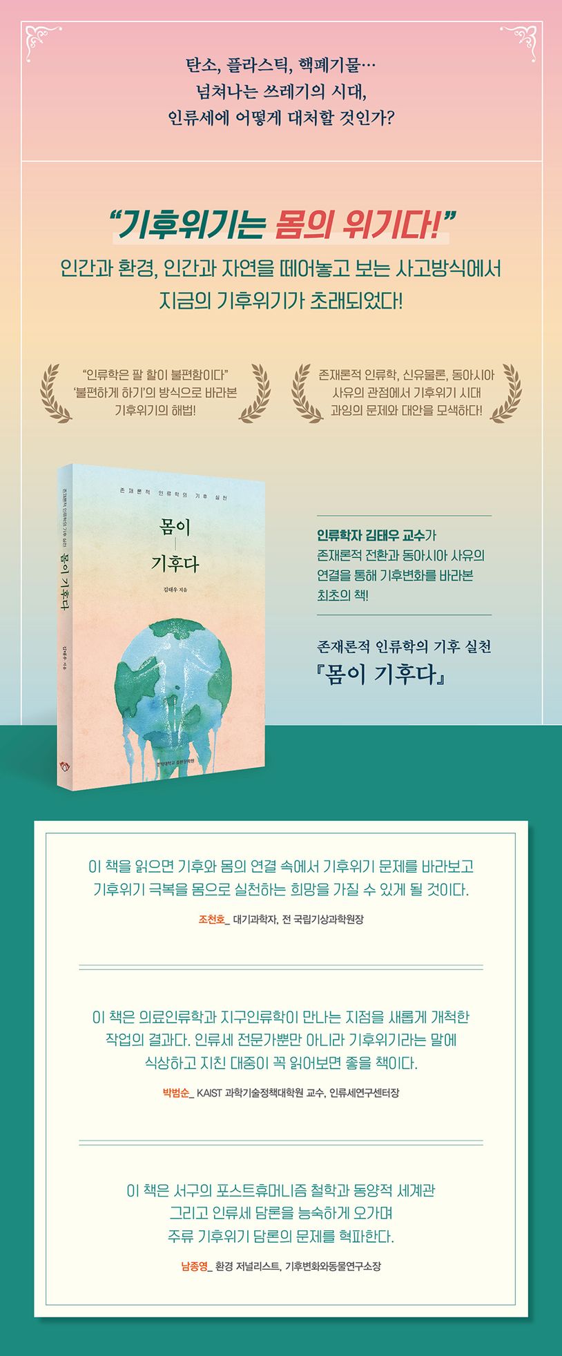 장기간 몸과 의료에 대한 현장연구를 진행해온 인류학자인 김태우 경희대학교 교수는 존재론적 인류학과 연결하여, 기후위기 문제를 풀어갈 수 있는 실마리를 몸에서 찾는다. 기후위기를 유발하는 행위자이면서 그 기후위기가 몸의 위기로 드러나는 바로 그 몸에서 희망을 찾는다.