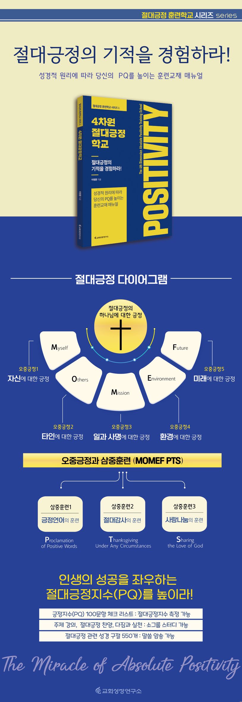 이영훈 목사의 『4차원 절대긍정학교』. 성경적 원리에 따라 긍정지수를 높이는 훈련 매뉴얼이다. 지능지수(IQ)나 감성지수(EQ)를 측정할 수 있는 것처럼 각 사람에도 긍정지수(PQ, Positivity Quotient)가 있다. 긍정지수가 높은 사람은 신앙생활이나 일상생활에서 건강하고 행복하고 성공적인 인생을 살 수 있다.