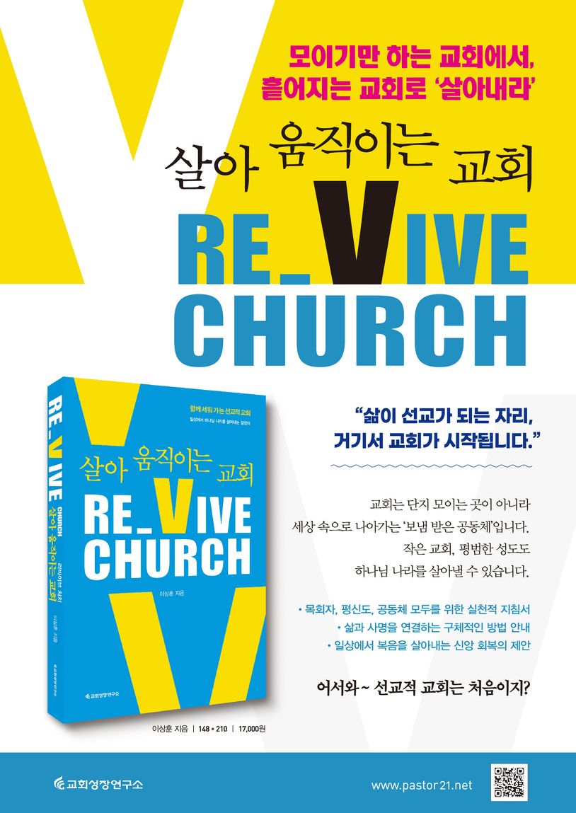 『Re_Vive Church : 리바이브 처치』는 이 전환의 여정을 함께하는 길잡이다. 신학적 용어나 이론에 치우치지 않고, 삶의 언어로 풀어낸 이 책은 가정과 일터, 그리고 내가 속한 공동체에서 그리스도의 증인으로 살아가려는 모든 그리스도인을 위한 선교적 교회의 길잡이다. 본문 곳곳에는 적용 가능한 사례들이 담겨 있으며, 각 챕터 말미에는 핵심 메시지와 함께 ‘생각 열기 - 삶과 연결 - 함께 고민하기 - 실천하기’의 흐름으로 구성된 소그룹 나눔 가이드가 제공된다. 개인 묵상은 물론 공동체 내에서 함께 읽고 나누고 살아내는 데도 유용하다.