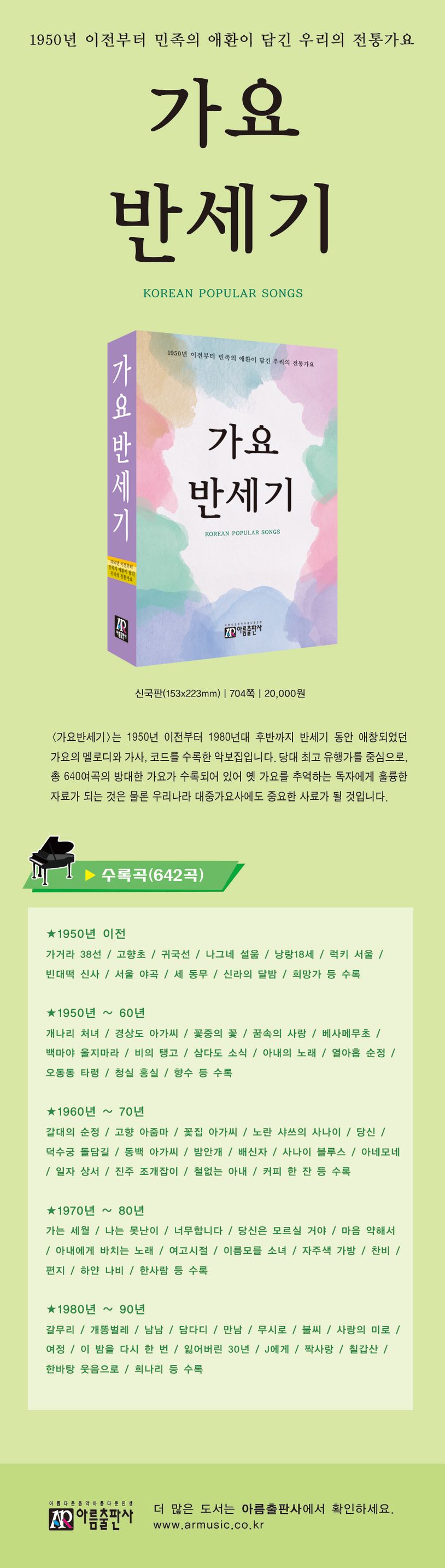 ‘가요반세기’는 1950년 이전부터 1980년대 후반까지 반세기 동안 애창되었던 가요의 멜로디와 가사, 코드를 수록한 악보집입니다. 당대 최고 유행가를 중심으로, 총 640여곡의 방대한 가요가 수록되어 있어 옛 가요를 추억하는 독자에게 훌륭한 자료가 되는 것은 물론 우리나라 대중가요사에도 중요한 사료가 될 것입니다.