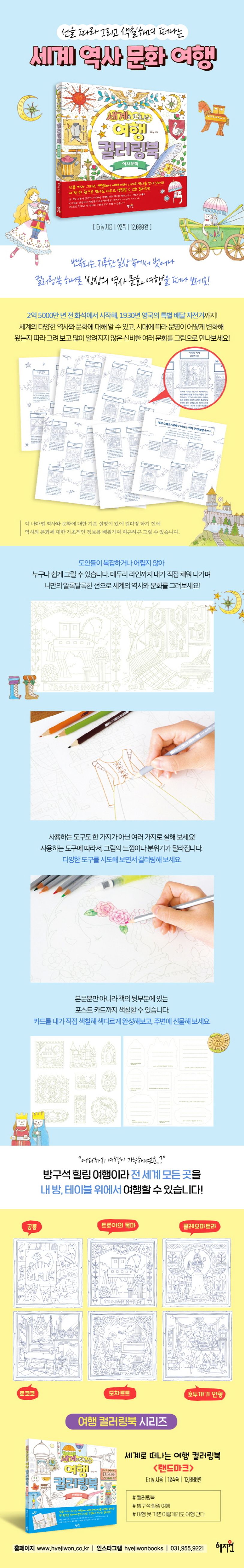 세계의 다양한 역사와 문화에 대해 알 수 있고 이국적이고 독특한 그림을 색칠할 수 있다. 시대에 따라 문명이 어떻게 변화해 왔는지 따라 그려 보고 많이 알려지지 않은 신비한 여러 문화를 만나 볼 수도 있다. 나라마다 각기 다른 문화들을 만나다 보면 자신도 모르게 계속 칠하게 될지도 모른다. 총 68개의 도안과 포스트 카드를 색칠하고 선물해보자. 책의 겉표지 또한 직접 채워 넣을 수 있다.