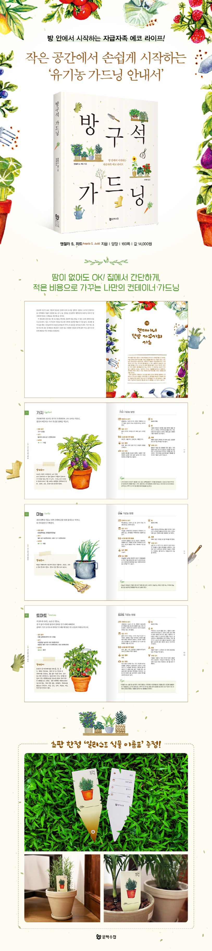 당장 방 안에서라도 녹색 생활을 시작할 수 있도록 돕는 《방구석 가드닝: 방 안에서 시작하는 자급자족 에코 라이프》는 유튜브와 인스타그램을 통해 활발히 활동하는 유명 마스터 가드너 앤절라 S. 저드의 ‘컨테이너 텃밭’ 가드닝 팁을 소개한다. 작은 화분에서 용량이 큰 컨테이너까지, 상자를 놓을 공간만 있으면 시작할 수 있는 ‘컨테이너 가드닝’은 공간의 제약이 없고 언제든 이동이 가능해 현대인의 가드닝 욕구를 가장 효율적으로 충족시킨다.