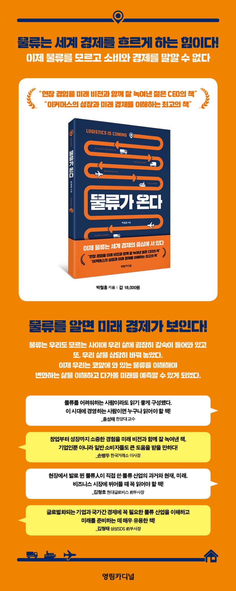 물류는 우리도 모르는 사이에 우리 삶에 굉장히 깊숙이 들어와 있고 또, 우리 삶을 상당히 바꿔 놓았다. 이제 우리는 코앞에 와 있는 물류를 이해해야 변화하는 삶을 이해하고 다가올 미래를 예측할 수 있게 되었다.