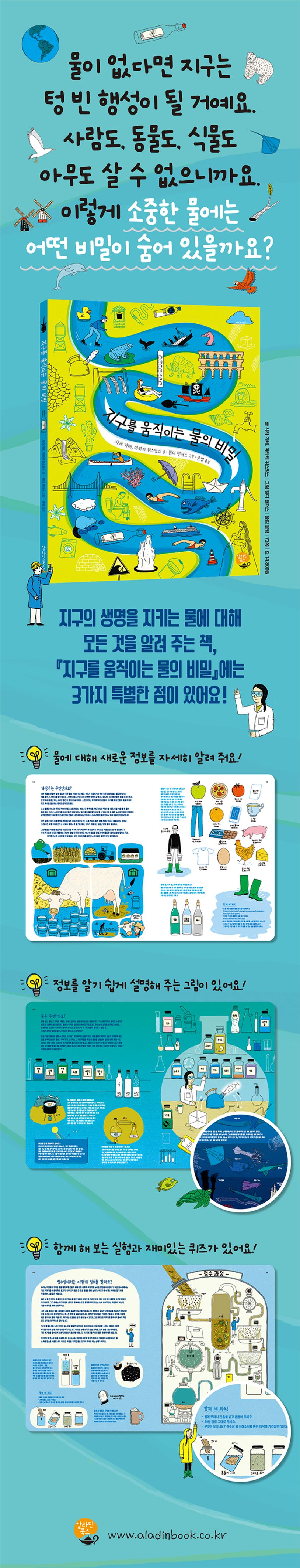 『지구를 움직이는 물의 비밀』에서는 바다에서 하늘로, 그다음 산과 강으로 그리고 다시 바다로 이동하는 물의 순환 과정과 물이 정수되는 과정, 그리고 정수된 물이 어떻게 우리 집까지 오는지 알기 쉽게 알려 줍니다. 또, 물이 우리가 숨 쉬는 공기, 먹는 음식과 어떻게 연결되어 있는지, 우리가 아무렇지 않게 하는 행동이 어떻게 물 순환의 균형을 깨뜨릴 수 있는지, 소중한 물의 미래가 어떤 위기에 놓여 있는지, 우리가 물을 지키기 위해 무엇을 해야 하는지 등 물에 관한 자세하면서도 흥미로운 정보를 줍니다. 이외에도 열대 우림의 동ㆍ식물, 구름의 형성과 날씨, 기후 변화, 가상수와 물발자국, 쓰나미의 원인 등 잘 몰랐던 물에 대한 새로운 정보가 풍부하게 담겨 있어 어린이 독자들이 호기심을 가지고 볼 수 있습니다.