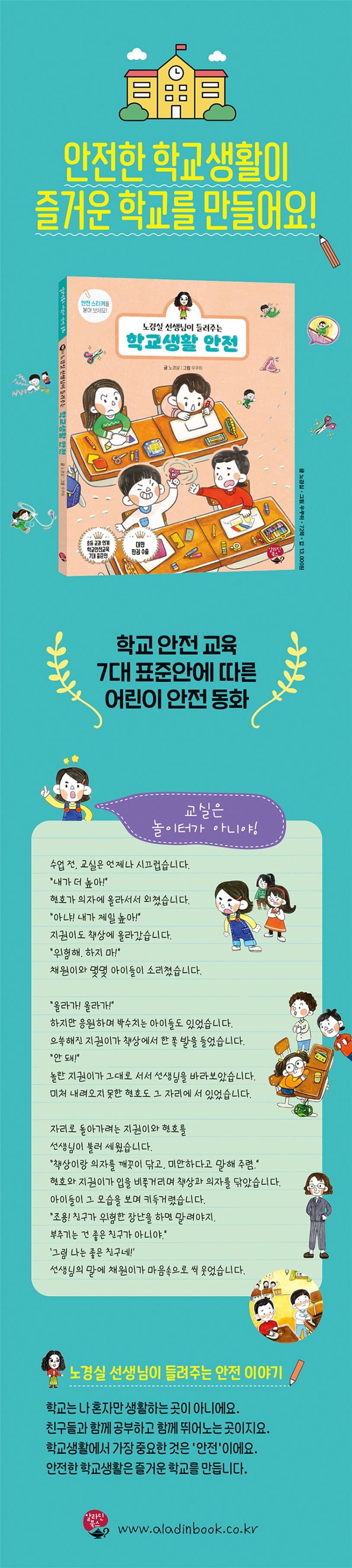 총 10권의 시리즈로 이루어져 있으며 그 첫 번째 권인 ‘학교생활 안전’은 안전하고 즐거운 학교생활에서 꼭 필요한 다양한 안전 지침들을 재미있는 이야기 속에 담고 있으며 안전 스티커를 통해 앞에서 배운 것들을 복습해 볼 수 있습니다.