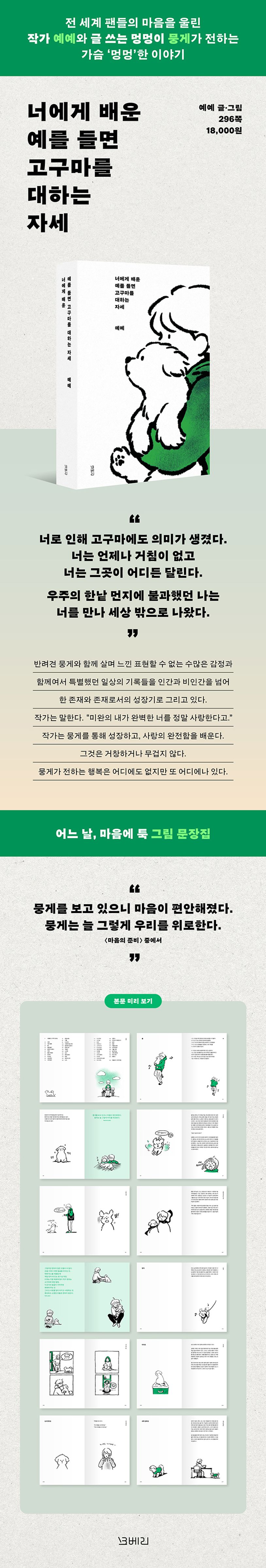이 책은 《글쓰는 멍멍이, 글멍》의 예예 작가가 선보이는 두 번째 에세이집이다. 《글멍》이 반려견 뭉게의 시선에서 쓴 책이었다면 《너에게 배운 예를 들면 고구마를 대하는 자세》는 오롯이 작가의 시선에서 쓰고 그려진다. 반려견 뭉게와 함께 살며 느낀 표현할 수 없는 수많은 감정과 함께여서 특별했던 일상의 기록들을 인간과 비인간을 넘어 한 존재와 존재로서의 성장기로 그리고 있다. 작가는 말한다. “미완의 내가 완벽한 너를 정말 사랑한다고.” 작가는 뭉게를 통해 성장하고, 사랑의 완전함을 배운다. 그것은 거창하거나 무겁지 않다. 뭉게가 전하는 행복은 어디에도 없지만 또 어디에나 있다. 뭉게가 보여 주는 사랑은 언제나 거침이 없다. 늘 살아 움직인다. 때론 너무도 강렬해 비현실적으로 느껴진다.