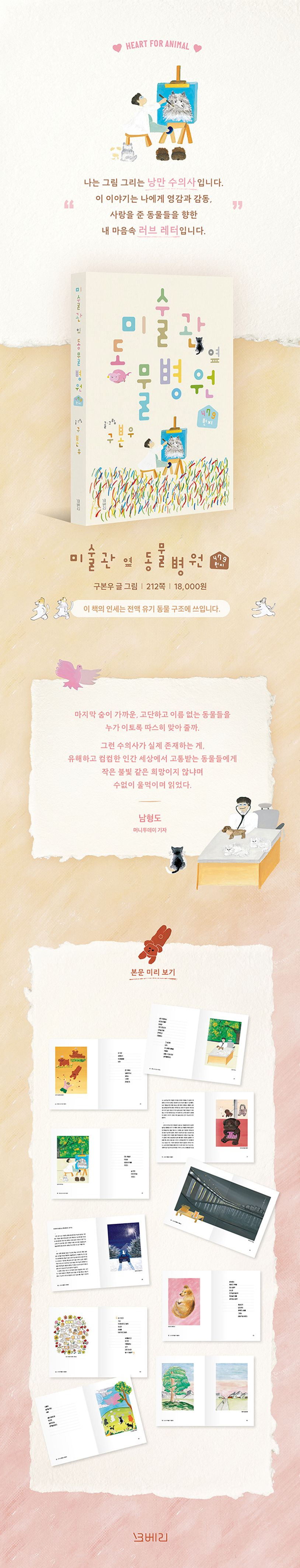 기록의 시작은 병원을 찾는 다양한 동물 친구들의 얼굴을 약봉지에 그림으로 그려 주기 시작하면서부터였다. 처음엔 귀여운 아이들의 모습을 담고자 했던 것이었지만, 점점 마음이 커 가기 시작했다. 병원을 찾아오는 아이들이 가진 저마다의 사연과 이야기들을 좀 더 많은 사람들과 나누어 보고 싶었기 때문이다. 그리고 그 이야기들이 누군가에게는 희망이, 누군가에게는 위로가 될 수 있기를 바랐다. 그런 작은 시작이 글과 그림으로 엮여 한 권의 이야기가 되었다. 이 이야기 속에는 행복과 슬픔, 두려움과 용기, 그리고 절망과 희망이 함께 공존한다. 그것은 곧, 우리의 삶과도 닮았다. 함께 공존한다는 것은 서로에게 힘이 되어 주고, 희망이 되어 주는 과정이 아닐까. 이 책은 한 평범한 수의사가 자신에게 영감과 감동, 사랑을 준 아이들을 기억하기 위해 쓰고 그린 간절한 마음이자, 그들에게 보내는 가슴 저린 러브 레터이다.