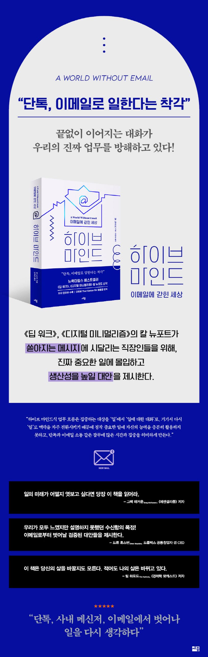 오늘도 울리는 업무 단톡, 사내 메신저, 그리고 이메일 폭풍… 답변해주다 보니 정작 내 할 일은 못했는데 하루가 다 갔다. 단톡과 메신저로 언제 호출될지 모르니 항상 긴장 상태다. 가장 큰 문제는 이 지속적인 소통이 우리가 일에 집중하는 시간을 수시로 방해한다는 것이다. 일과 생산성, 디지털 문화의 전문가이자, 잠재되어 있던 문제를 표면화하고 그 대안을 제시하며 많은 팬을 보유하고 있는 칼 뉴포트는 이 책에서 업무 중 수시로 주고받는 메시지 때문에 우리의 주의가 분산되며, 이는 정작 중요한 업무에 몰입할 수 없게 만든다고 말한다. 그래서 결국 조직 전체의 생산성이 떨어진다는 것이다. 여기에서 칼 뉴포트는 ‘하이브 마인드 활동과잉hyperactivehive mind’이라는 새로운 개념을 이야기한다.