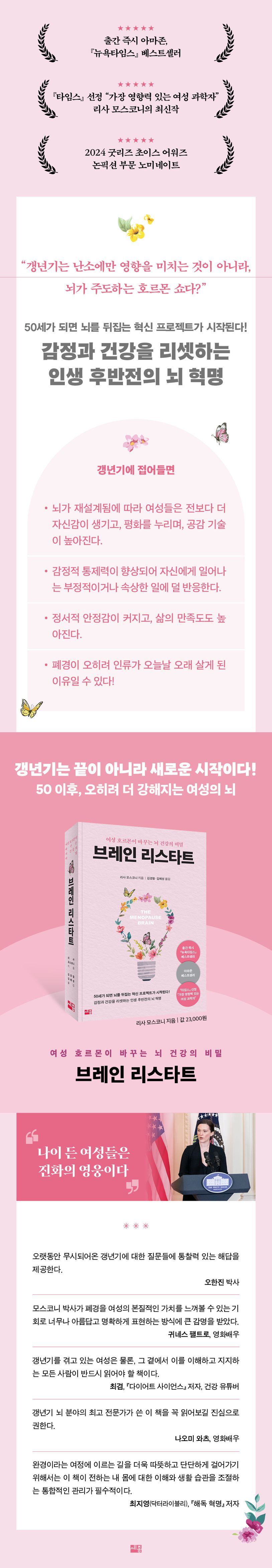 이책은회피하거나억눌러야하는것으로인식되었던갱년기를완전히새로운관점에서바라본다.안면홍조,불면증,우울감,브레인포그,건망증,감정기복등갱년기증상의원인을단순히생식기관의쇠퇴가아닌뇌의변화에서찾았다는점에서,이책이주는메시지는혁신적이다.갱년기이후뇌가재설계됨에따라여성들은전보다더자신감이생기고,정적통제력이향상되며,공감기술이높아진다.그결과정서적안정감이커지고삶의만족도도높아진다.