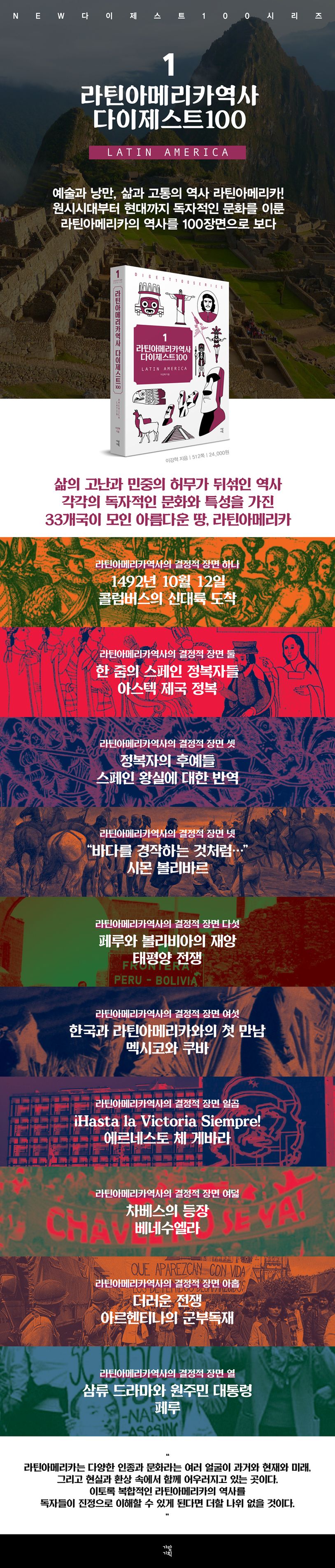 《라틴아메리카역사 다이제스트100》은 각 지역, 국가별로 역사적 중요한 장면을 100가지로 꼽아 구성한 가람기획의 ‘NEW다이제스트100’ 시리즈의 첫 번째 책이다.