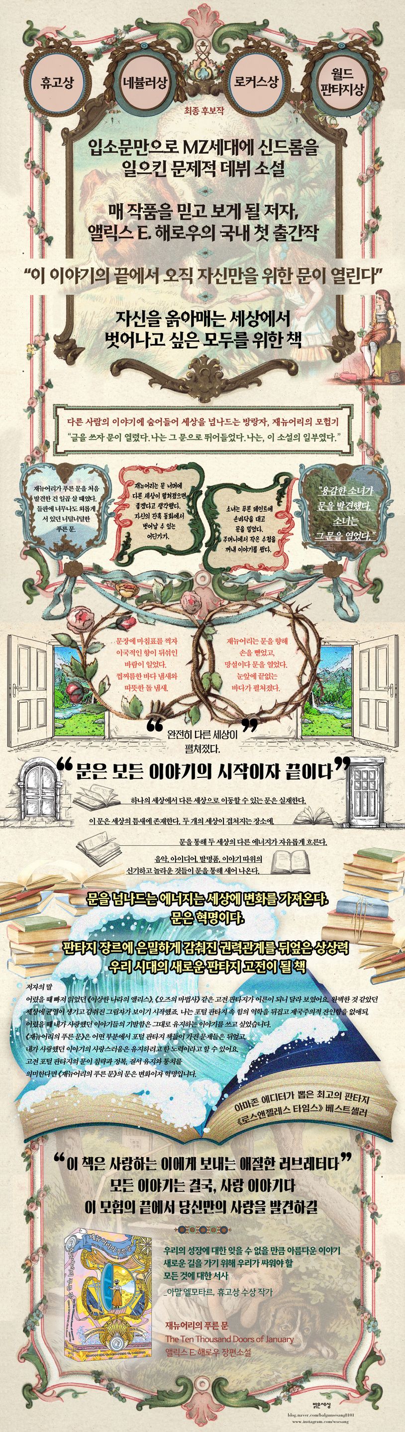 데뷔작으로이렇게큰주목을받은소설은흔치않다.앨릭스E.해로우의《재뉴어리의푸른문》은휴고상,네뷸러상,로커스상,월드판타지상에최종후보작이되었고,아마존편집자가뽑은최고의판타지에선정되었다.언론과평단의호평을받으며《로스앤젤레스타임스》베스트셀러에등재되기도했다.