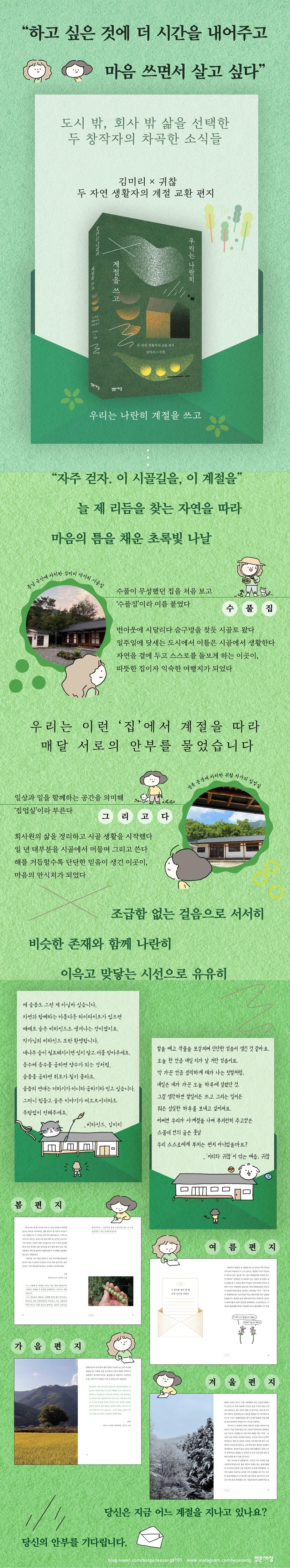 《우리는 나란히 계절을 쓰고》는 도시와 회사 밖 삶을 선택한 김미리, 귀찮 작가가 사계절 동안 서로에게 쓴 교환 편지다. 다르고도 비슷한 삶의 궤적을 그리는 두 작가는 자연 생활자로 지내는 시골에서의 일상과 프리랜서로서의 독립을 지극히 현실적으로 보여준다. 이 글에는 자신들이 선택한 삶 속에서 많은 일들로 흔들리고 불안하지만, 늘 돌아오는 계절과 언제나 제자리를 찾는 자연처럼 순리에 따라 ‘독립적이고 주체적인 나’로 살아가고자 하는 노력이 담겨 있다. 자기 자신에게 집중하고, 매 순간 서로의 존재에 위안받는 두 사람의 이야기는 ‘이런 삶이 괜찮을까’라는 고민을 안고 하루하루를 보내는 모든 이들에게 따스한 손을 내민다.