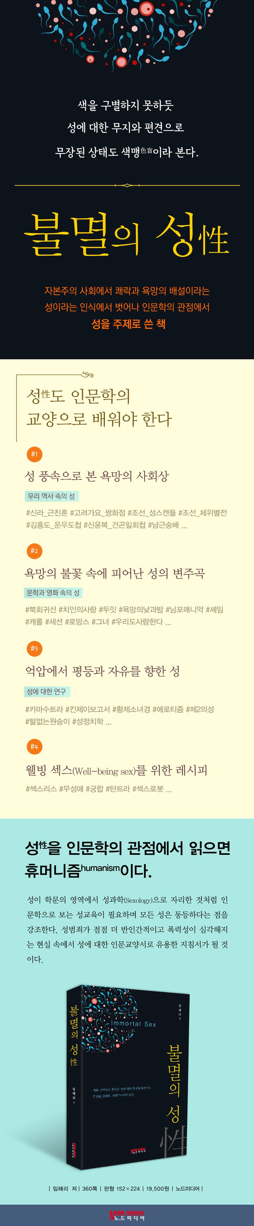 이 책 『불멸의 성性』은 자본주의 사회에서 쾌락과 욕망의 배설이라는 성이라는 인식에서 벗어나 인문학의 관점에서 성을 주제로 쓴 것이다.