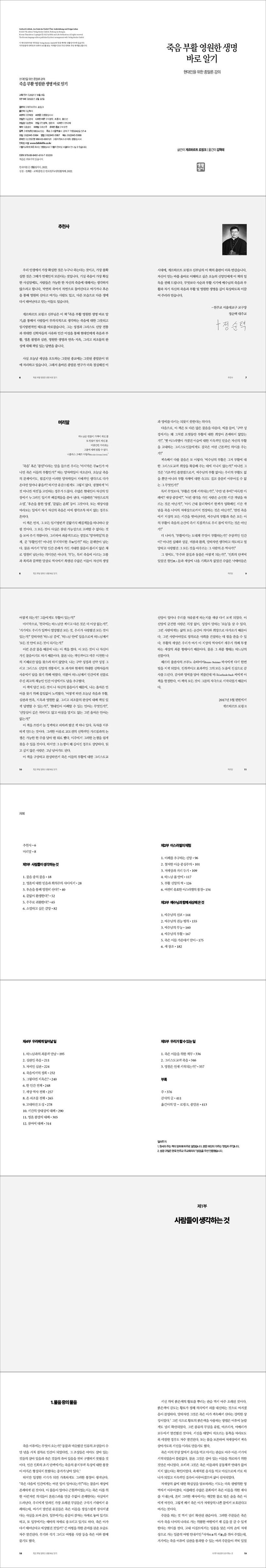 오늘날세상을오도하는그릇된종교에는그릇된종말론이뒤에자리하고있습니다.그래서올바른종말론연구가더욱절실해진이시대에,게르하르트로핑크신부님의이책의출판이더욱반갑습니다.자신이믿는바를올바로이해하고싶은오늘의신앙인에게이책의일독을권해드립니다.무엇보다사순과부활시기에예수님의죽음과부활과자기자신의죽음과부활및영원한생명을깊이묵상하도록이끌어주리라믿습니다.(정순택대주교의추천사,6-7쪽)