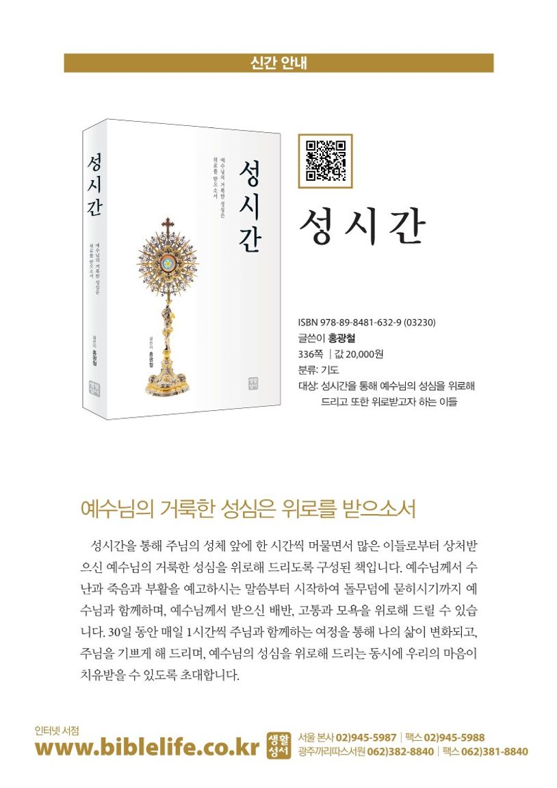 이 책 『성시간』은 성시간을 통해 주님의 성체 앞에 한 시간 동안 머물면서 많은 이들로부터 상처받으신 예수님의 거룩한 성심을 위로해 드리도록 구성되었다. 예수님께서 수난과 죽음과 부활을 예고하시는 말씀부터 시작하여 돌무덤에 묻히시기까지 예수님과 함께하며, 예수님께서 받으신 배반, 고통과 모욕을 위로해 드릴 수 있다. 30일 동안 매일 1시간씩 주님과 함께하는 여정을 통해 나의 삶이 변화되고, 주님을 기쁘게 해 드리며, 예수님의 성심을 위로해 드리는 동시에 내 마음이 치유받을 수 있도록 초대한다.
