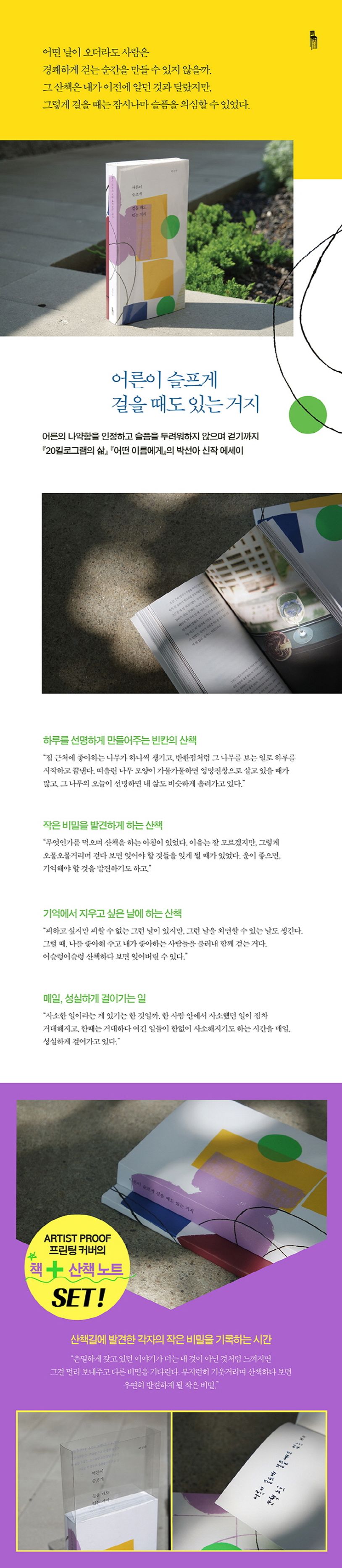 마음에 비해 생각이 빠르게 늙어 서글플 때, 회사에서 의젓하게 자리를 차지하고 앉아 있다가 화장실에 가서 아이처럼 엉엉 울 때, 주변의 많은 것이 멀어지는 일을 담담하게 받아들여야 할 때…. 어른 노릇이 버거워질 때마다 혼자, 때로는 좋아하는 사람과 함께 걸었던 시간을 박선아 작가가 다정하면서도 솔직한 에세이와 감각적인 사진들로 담아냈다.