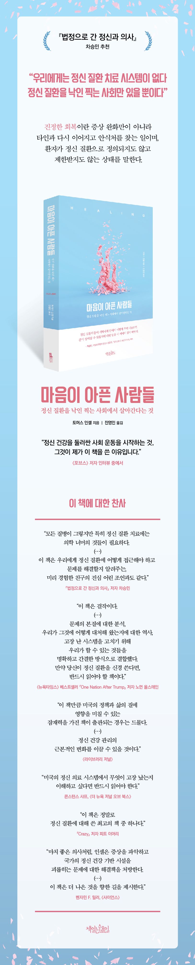 오늘날 정신 보건의 현주소를 분석한 이 책은 ‘회복’을 ‘의미 있고 소중한 것들을 누릴 수 있는 삶으로의 복귀’로 새롭게 정의한다. 이 책이 제시하는 질문은 분명 우리 사회에도 유효하다. 정신 질환 치료는 왜 과학과 의학의 발전에도 불구하고 좋은 결과를 거두지 못할까? 왜 우리는 질병일 뿐인 정신 질환을 정체성과 동일시할까? 정답은 바로 우리의 편견과 차별에 있다. 현재의 치료법으로도 정신 질환을 충분히 치료할 수 있다. 그러나 환자를 질환과 동일시하고 그들을 사회 구성원으로 존중하지 않는 이상, 우리는 영원히 정신 질환을 치료할 수 없다. 이 책은 정신 질환에 존재하는 차별을 조명하며 새로운 시각을 제시한다. “정신 질환은 사형 선고가 아니며 사람은 회복할 수 있다. 회복은 증상 감소를 넘어서 완전하고 의미 있는 삶으로의 복귀다.”