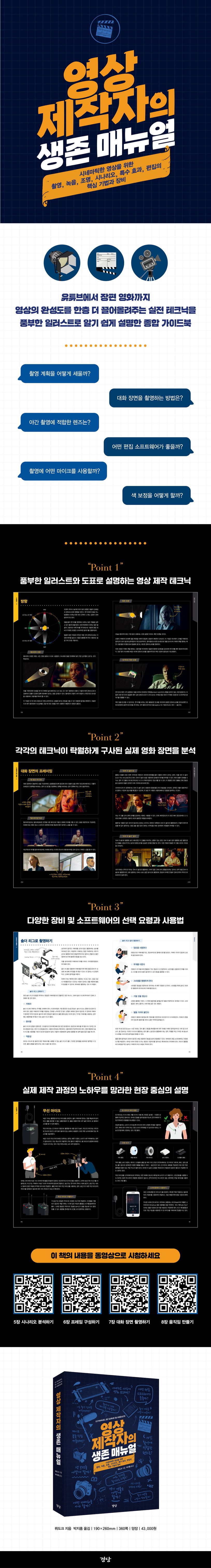 이 책은 유튜브 동영상에서 장편 영화에 이르기까지 다양한 영상을 제작하는 데 필요한 여러 가지 핵심 테크닉과 장비 사용법을 풍부한 일러스트와 도표로 알기 쉽게 풀이한 현장 중심의 종합 실전 가이드북이다. 시나리오 작성부터 최종 편집에 이르는 10개의 장으로 구성된 이 책을 통해 렌즈 선택, 사운드 녹음, 장면 조명, 프레임 구성, 대화 촬영, 특수 효과 구현, 영상 편집 등 다양한 제작 단계에 필요한 기본 지식을 차근차근 익힐 수 있다. 프랑스의 전천후 영상 제작자로 활동해온 저자는 이 실용적인 매뉴얼에서 자신의 경험과 노하우를 한가득 공개하면서, 한정된 예산으로 멋진 영상을 만들어내는 방법을 배울 수 있게 해준다. 각각의 테크닉이 탁월하게 구사된 실제 영화 장면을 분석하면서 그 효과를 간단한 방법으로 재현할 수 있는 ‘요령’도 함께 일러주는 이 책은 영화 및 영상 전공자는 물론 이제 막 영상 제작에 뛰어들려는 1인 미디어 크리에이터에 이르기까지 모든 이들을 위한 필독서이다.