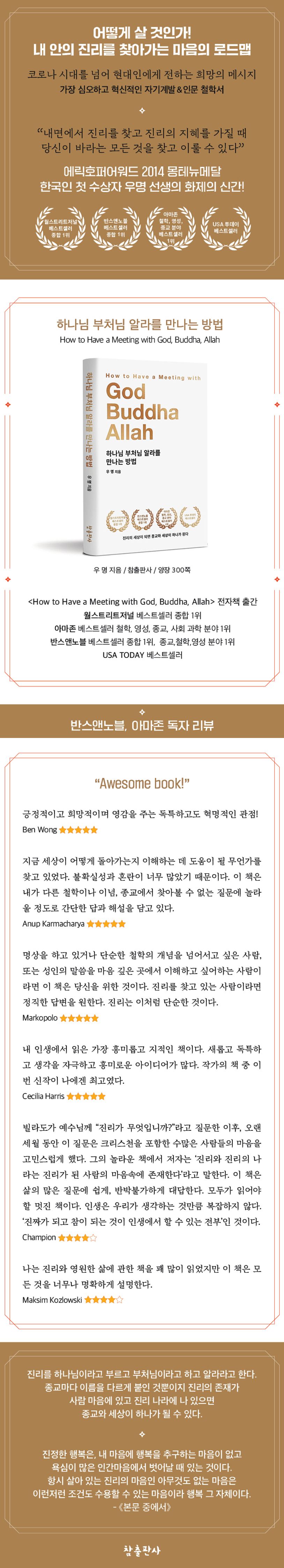이 책은 종교의 본질에서부터 개인의 마음 문제에 이르기까지, 214개의 화두와 질문에 대한 답을 담고 있다. 실상세계에서 이 세상의 이치를 밝힌 저자는 그 답을 통해 종교의 목적과 깨달음, 인간의 마음은 어떤 것이며, 어떻게 하면 진짜 나를 찾고 자기 안에 있는 진리를 찾아 그 진리가 되는지 알려준다. 일상의 삶을 편안하고 행복하게 하는 방법도 그 길 위에 있다는 것을 보여준다.