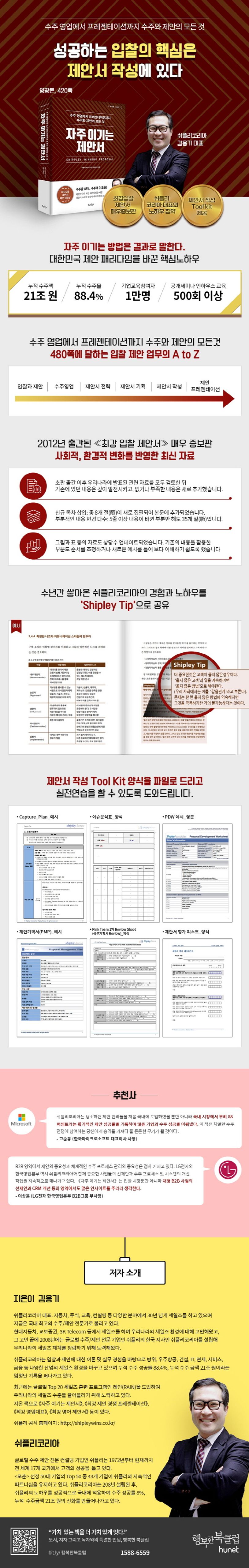 눈앞에 다가온 입찰 경쟁에서 이기기 위해 어떻게 제안 전략을 세우고, 제안서를 작성하고, 프레젠테이션해야 할 것인가? 국내 최고의 수주 제안 전문가 김용기 쉬플리코리아 대표가 글로벌 수주 제안 전문 컨설팅 기업인 쉬플리의 방법론과 자신만의 노하우를 집약해 ⟪자주 이기는 제안서⟫를 출간했다. 수주 영업에서부터 제안 프레젠테이션까지 수주 제안의 모든 과정을 가이드하며 독자를 승리의 길로 이끄는 책이다.