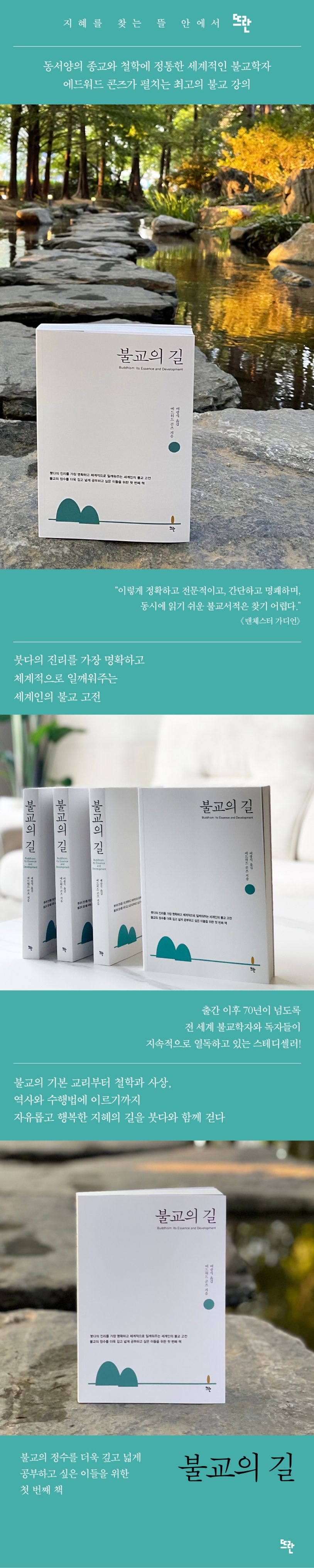 이 책 『불교의 길Buddhism: Its essence and development』은 콘즈 박사가 불교의 기본 교리부터 철학과 사상, 역사와 수행법에 이르기까지 불교의 정수를 쉽고 넓고 깊게 강의한 불교 개론서이다. 1951년 초판 출간 이래 70년이 넘도록 전 세계 불교학자와 독자들이 지속적으로 열독하고 있는 스테디셀러로서 붓다의 진리를 가장 명확하고 체계적으로 일깨워주는 세계인의 불교 고전으로 정평이 나 있다.