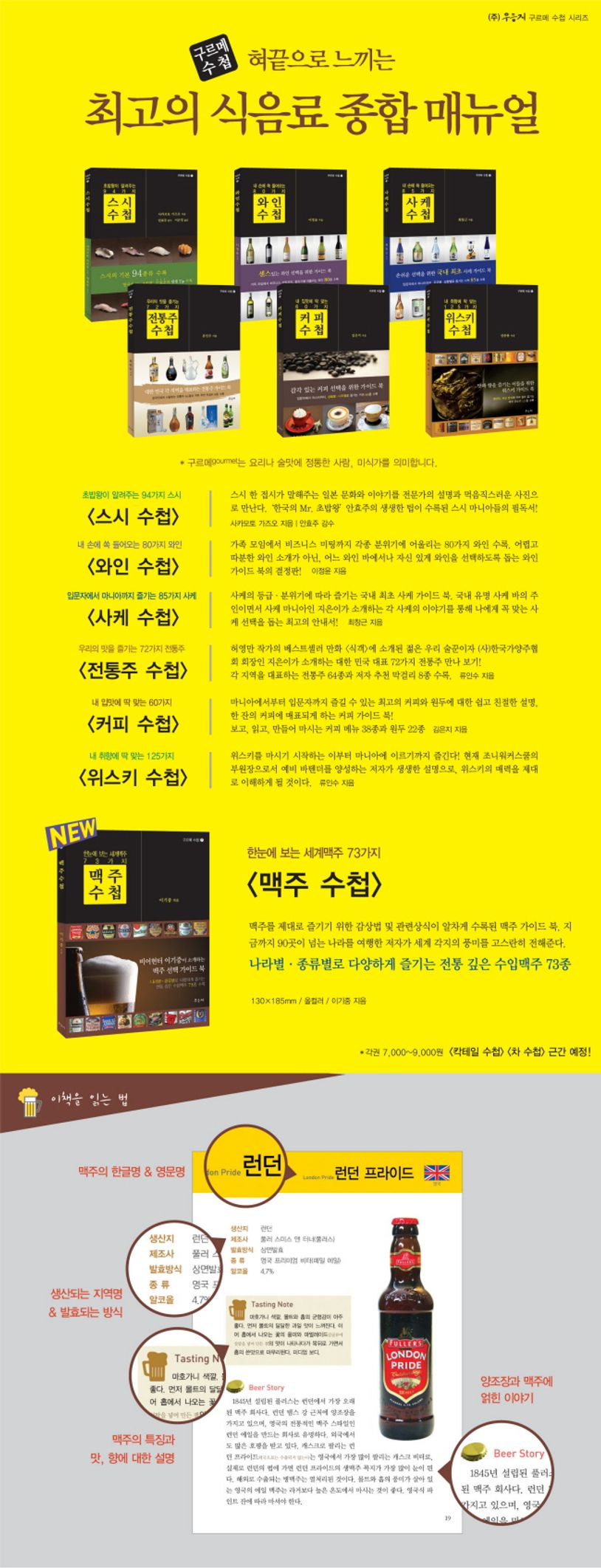 한눈에보는세계맥주73가지『맥주수첩』비어헌터이기중이소개하는맥주선택가이드북나라별?종류별로다양하게즐기는전통깊은수입맥주73종수록『맥주수첩』은맥주에대한기본상식을비롯하여우리나라에수입된맥주가운데대형마트나수입맥주매장에서접할수있는73가지맥주에관한간력한설명을담은맥주가이드북이다.본도서에실린73종의맥주는크게▲유럽맥주▲북미?오세아니아맥주▲아시아맥주로나뉘어나라별로소개되고있으며,그외에도맥주의재료를비롯한색깔과종류,그리고맥주감상법과맥주를제대로즐길수있는맥주잔에대해서도설명하고있다.맥주를찾아서지금까지90곳이넘는나라를여행한저자의설명은맥주의풍미를더욱더진하게느낄수있도록도와줄것이다.몇년전부터국내의맥주지형도가바뀌면서우리는수십가지의외국수입맥주를쉽게접할수있게되었다.이와관련저자는“예전에는맥줏집에가서단순히맥주를주문하면되었지만,이제는맥주에관한지식이없으면마트에서맥주를고르거나맥주전문점에서맥주를주문하기도힘들게되었다.”고강조했다.한편,이책은‘구루메*수첩’의일곱번째권으로첫번째권인<스시수첩>그리고<와인수첩><사케수첩><전통주수첩><커피수첩><위스키수첩>에이어식음료에대한최근독자들이필요로한정보를한눈에볼수있게구성했다는장점이있다.*‘구르메(gourmet)는프랑스어로요리나술맛에정통한사람,미식가를의미합니다.’