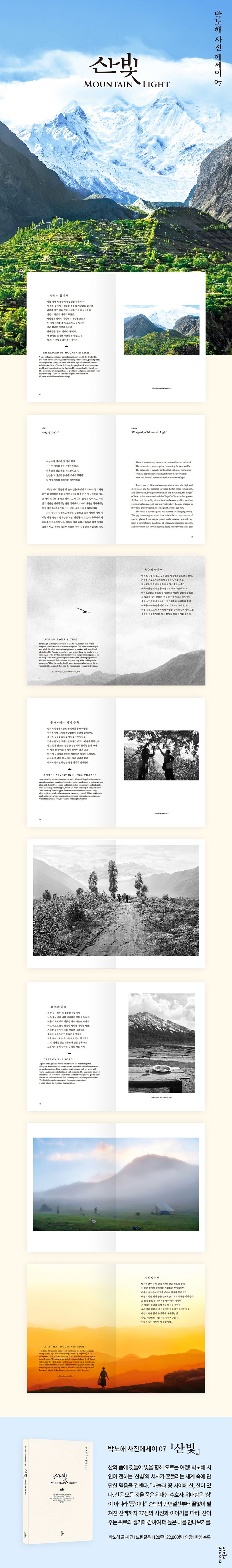 『산빛』에 담긴 흑백사진 28점은 명암의 깊이와 품격을, 컬러사진 9점은 만년설산부터 칼데라까지 고유한 색감과 정서로 시각적 상쾌함을 선사한다. 무엇보다 박노해 사진에세이의 감동은 사진마다 더해진 37편의 글이다.