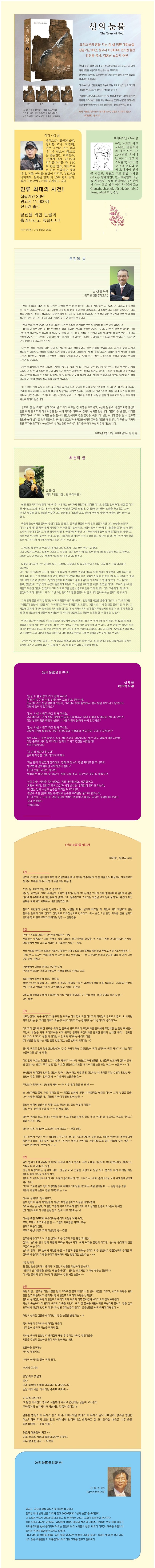 신의눈물을쓴김실작가는이책에대해서다음과같이고백한다."이대하소설은한국현대사의역사적사건과당시의사회적배경을시공간으로삼은서술구조이며등장인물의상당수를실존인물에서차용했고,한국사회의풍속도또한불과50여년안팎의우리들실상의숨결을그대로불어넣도록시도했다.이야기구조의이러한점을감안해서대하소설이라는기나긴물줄기를따라저자의목소리를실어보았다.저자는이모든것에대해말하기를,“내아둔한머리위에서들려오는창조주하나님의목소리를따라갔을뿐이다.부끄러운글발의발자국에대해오직눈물을떨구며고개를숙일뿐이다.”라고말하고있다.작품속에등장하는수백인물들의개성이저마다독특하지만우리역사의큰페이지를장식한박정희대통령을시해했던김재규정보부장의권총(32구경7연발월터ppk권총총번159270)이어떻게북파공작원무태의손에숨겨져있었는지가흥미롭기짝이없다.더욱이이권총이험난한대통령의길을걷는김귀로를죽이려는마피아를향해불을뿜었다는사실이소설속에서굉장한충격으로독자들의심금을울린다.김실작가가역사에서실존했던권총을가상의소설속에재등장시킨의도는무엇일까.김실작가에대해김진홍목사는이렇게평했다."근래한국문단에는크리스천의혼을지닌뚜렷한대작이등장하지못했습니다.그러기에나는신의눈물이그자리를메워줄내용을충분히갖추고도남는대작이라고확신합니다,“결론적으로읽어보지않고는설명이되지못하는작품이다.더욱이이작품은김실작가의육필로쓰여졌고,그원고량이작가의키를훨씬넘고도중학생키하나를더보태는높이로올라간다.김실작가는4반세기가넘는세월을바쳐〈신의눈물〉을집필했다.작가의창작과정은어떤산술의셈법으로도설명할수가없다.이책을읽어본신재용박사는다음과같이토로했다."2600쪽짜리방대한소설을밤을새워가며일주일만에읽어냈다는사실이스스로도믿기지않는다.또한책을읽은사람들의말을들어보면,‘이책의내용을영화화하면하나같이벤허를능가하는작품이될것이다.’라고말하고있다.”