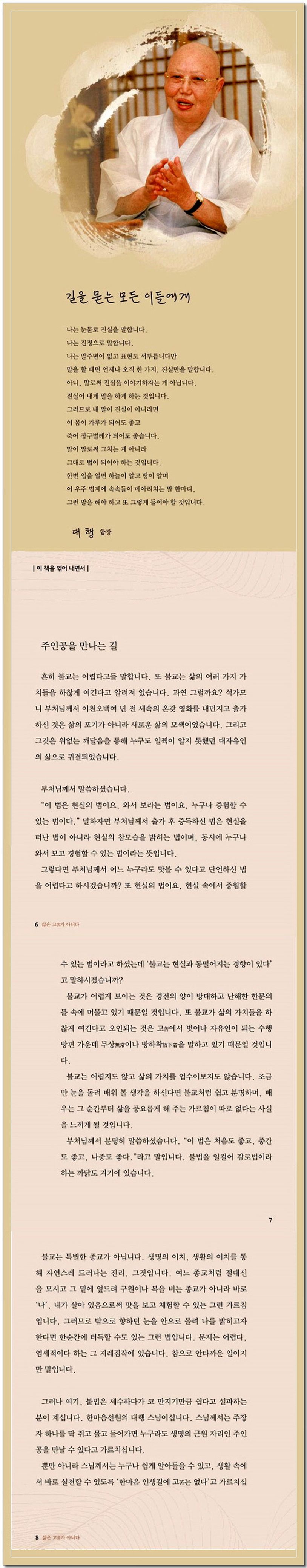 대행스님 법어집 “삶은 고가 아니다”는 현대불교신문에서 1996년 처음 발행하여 22쇄를 거듭 출간한 스테디셀러입니다. 불자들뿐만 아니라 일반인들도 쉽게 다가갈 수 있도록 엮은 이 책은 진정한 사람으로 살기 위해 반드시 알아야 할 마음의 본질에 대해 이야기하고 있습니다.