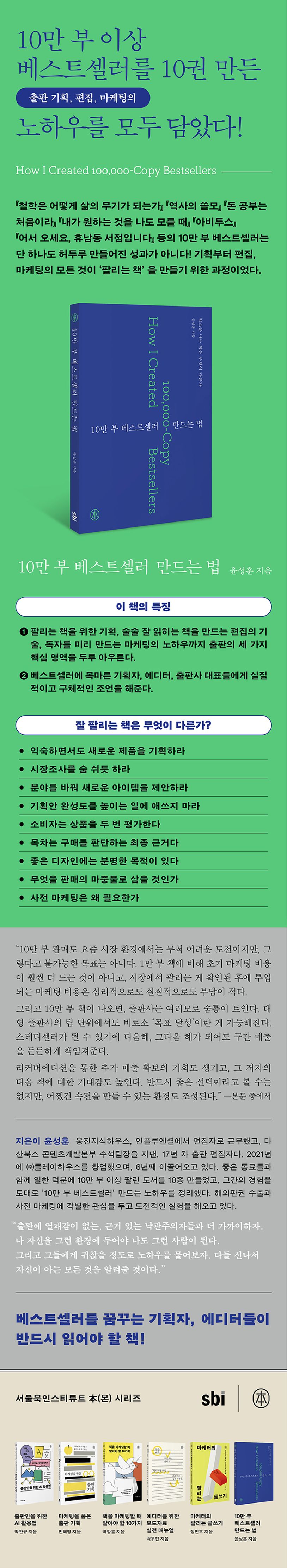 『10만 부 베스트셀러 만드는 법』에는, 16년간 단행본 출판사에서 편집자로 일하며 ‘1만 부나 100만 부가 아닌 왜 10만 부 베스트셀러를 만들어내는 것이 중요한지, 어떻게 10만 부 베스트셀러를 만들어냈는지, 그리고 앞으로 10만 부 이상의 베스트셀러를 만들기 위해서는 무엇에 집중해야 하는지’에 대한 저자의 경험과 노하우가 가득 담겨 있다. 특히 저자는, 함께했던 선배들이 그랬듯, 자신 또한 동료와 후배 출판인들에게 실무에서 작은 도움이라도 주고 싶고, 사양 산업으로 치부되는 출판업계에서 ‘나도 10만 부 베스트셀러를 만들어보고 싶다’는 비전을 갖는 데 조그만 힌트라도 건네고픈 마음으로 이 책을 썼다.