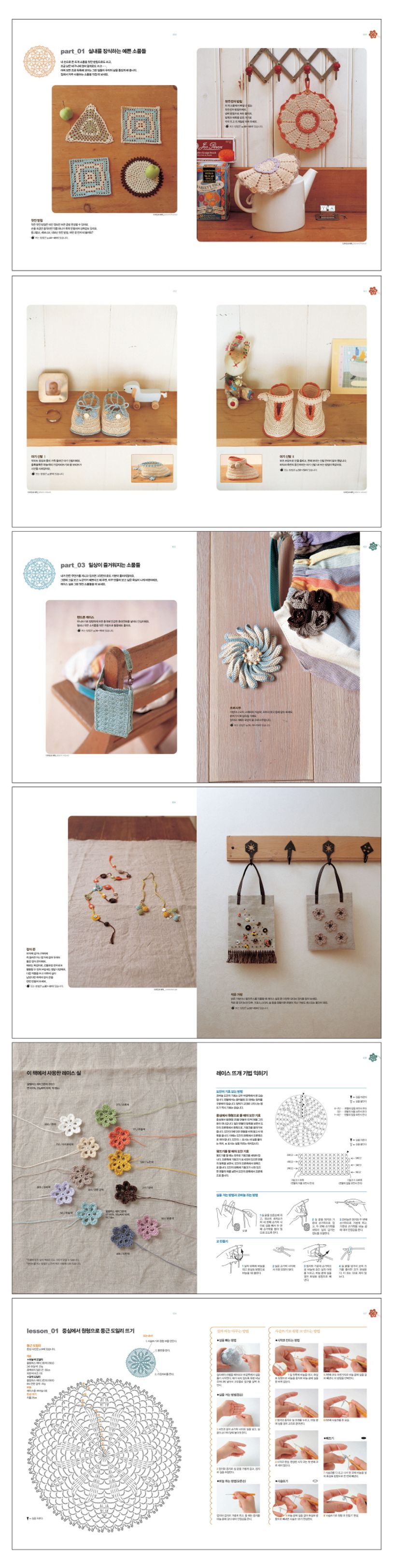 간단하게 만들 수 있는 찻잔 받침과 주전자 받침, 인테리어 소품으로 활용할 수 있는 귀여운 도일리, 병이나 바구니에 장식하면 포인트가 되는 레이스 소품, 동전 지갑과 코르사주, 핸드폰 주머니까지 레이스 손뜨개로 이 세상에 단 하나뿐인 나만의 소품을 만들 수 있도록 구성하였다. 도안의 기호 보는 방법, 실을 거는 방법과 쥐는 방법부터 중심에서 원형으로 둥근 도일리 뜨기, 사슬뜨기로 시작코 만들어 평뜨기로 사각 도일리 뜨기 등의 기본과 함께 각각의 소품 도안을 수록하였다.
