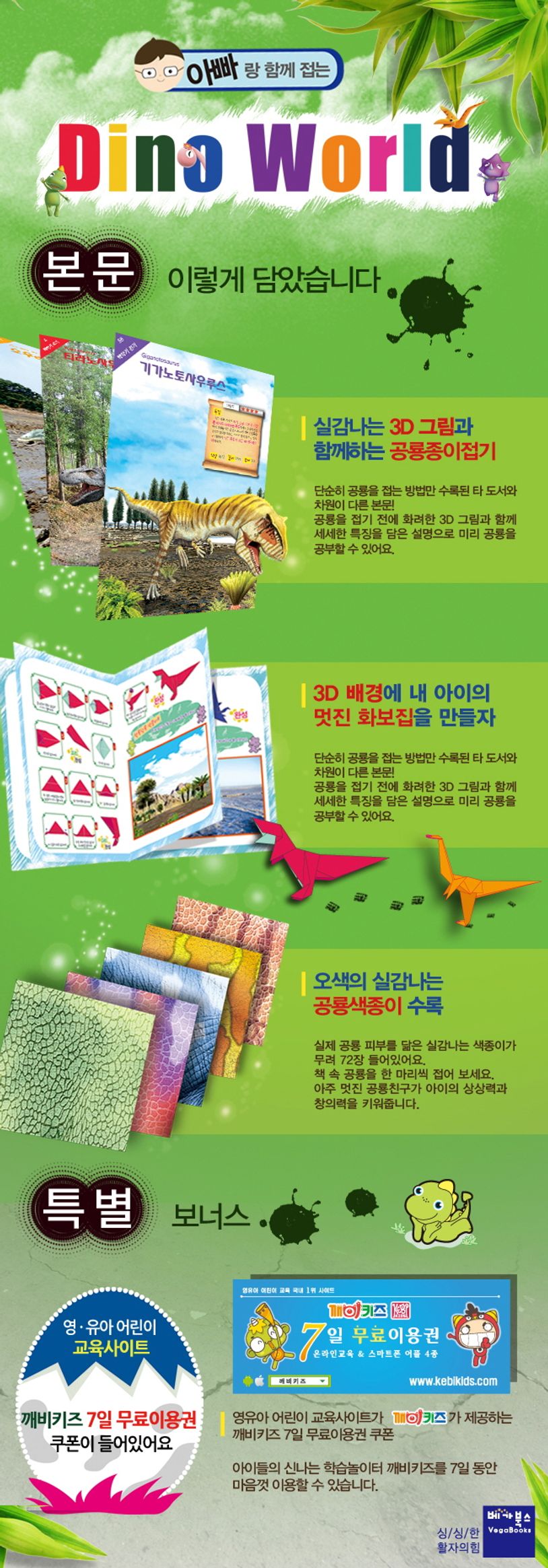 아빠와 함께 접는『Dino World』. 티라노사우루스, 브라키오사우루스, 스테고사우루스, 트리케라톱스, 프테라노돈 등 알록달록 색종이로 공룡을 접을 수 있도록 안내하는 책이다. 공룡을 접기 전 화려한 3D 그림과 함께 세세한 특징을 담은 설명으로 미리 공룡을 공부할 수 있다. 또한 공룡을 붙일 수 있는 멋진 배경이 담겨 있어, 아이만의 공룡화보집을 만들 수 있다. 실제 공룡 피부를 닮은 실감나는 색종이도 수록되어 있다.