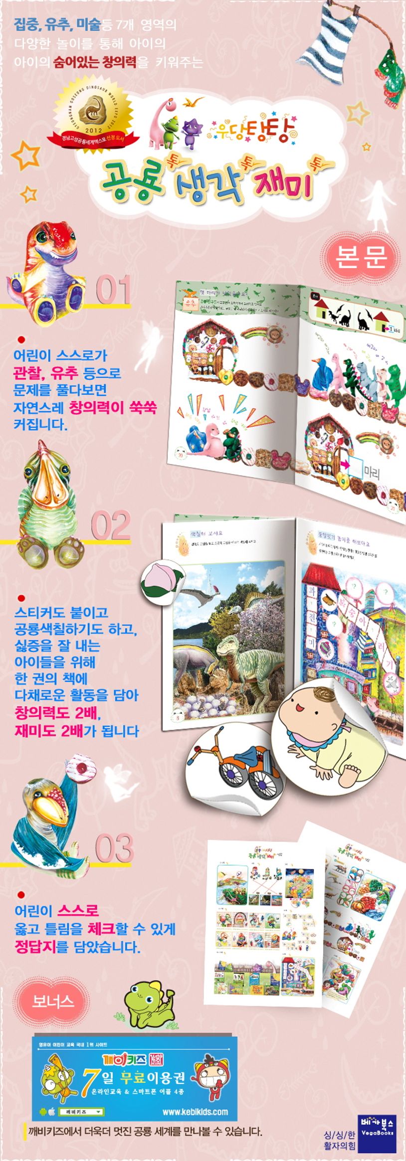 『우당탕탕 공룡 톡 생각 톡 재미 톡』은 공룡과 함께하는 다양한 놀이를 통해 아이들의 숨어있는 창의력을 키워주는 책이다. 매 장면마다 등장하는 공룡 친구들은 아이들의 일상생활을 보여주기도 하고 아이들에게 재미있는 그림과 놀이를 제공한다. 또한 공룡 스티커 붙이기, 상상속의 공룡을 접어보는 종이접기, 멋진 공룡을 개성에 맞게 꾸며보는 색칠하기 등 아이들이 좋아하는 재미있는 활동은 공룡과 친구가 되고 상상력과 집중력을 길러줄 수 있을 것이다.
