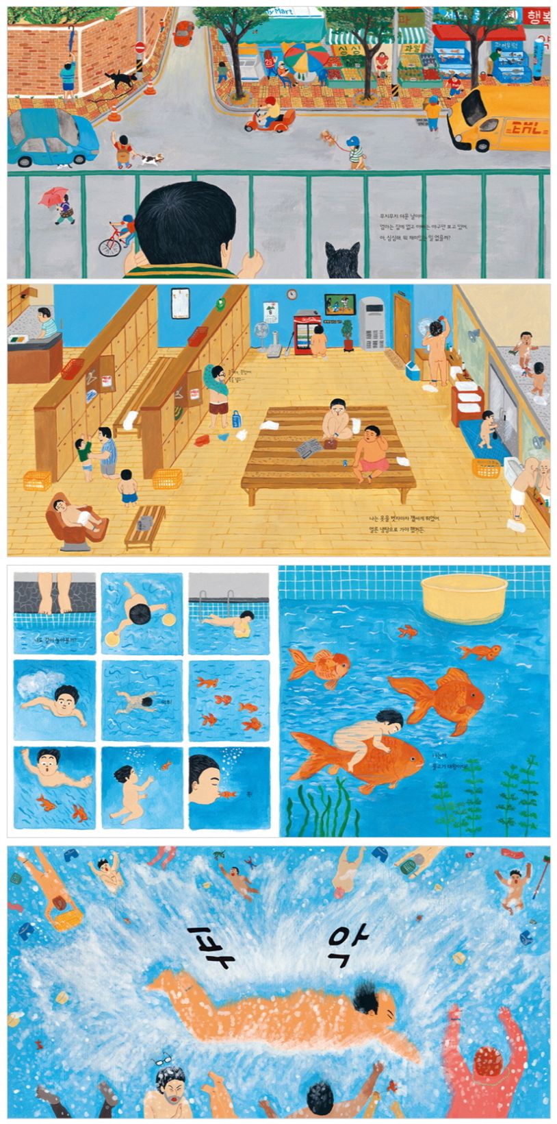 무지무지 더운 여름날, 심심한 준우는 창문 밖으로 동네 구경을 하고 있어요. 이를 본 아빠는 준우에게 목욕탕에 가자고 합니다. 더운 여름날 바다도 아니고 수영장도 아닌 목욕탕이라니, 준우는 아빠의 말이 맘에 들지 않았지만 어쩐지 냉큼 아빠를 따라나섭니다. 한 손에 수상한 검은 봉지를 쥐고요. 준우는 목욕탕에 도착하자마자 냉탕으로 달려가 검은 봉지 안에 있는 물고기들을 풀어 놓죠. 더운 여름 어항 속에 갇혀 있는 물고기들이 자신의 모습처럼 안타깝게 느껴졌는지 아빠 몰래 물고기들을 목욕탕으로 데려왔죠. 그런데 물고기들과 함께 헤엄치며 놀던 준우가 잠시 자리를 비운 사이에 엄청 큰 아저씨가 그 냉탕으로 들어가는 게 아니에요? 결국 준우가 냉탕에 풀어 넣은 물고기들로 목욕탕은 한바탕 소동이 벌어집니다. 사람들이 모여들고 아빠는 어쩔 줄 모르고, 준우도 이만저만 걱정이 아니죠. 무더운 여름을 피해 목욕탕에 왔건만, 잔뜩 화가 난 듯한 사람들의 모습에 준우와 아빠의 등에는 식은땀만 흐릅니다. 무더운 여름을 목욕탕에서 시원하게 보내려 했던 준우와 아빠의 계획은 실패하고 만 걸까요?