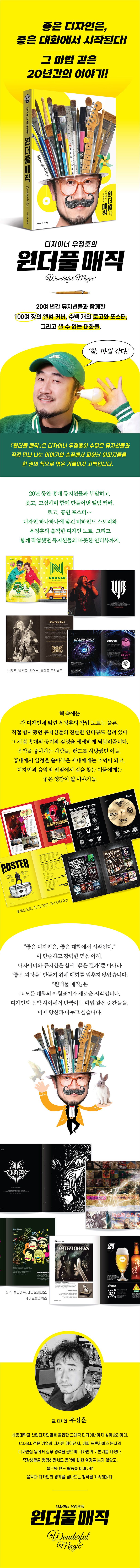『원더풀 매직』은 디자이너 우정훈이 지난 20여 년간 홍대 앞에서 뮤지션들과 함께 호흡하며 쌓아온 디자인 작업의 기록이자, 그 안에 깃든 사람과 음악, 대화에 관한 이야기입니다.