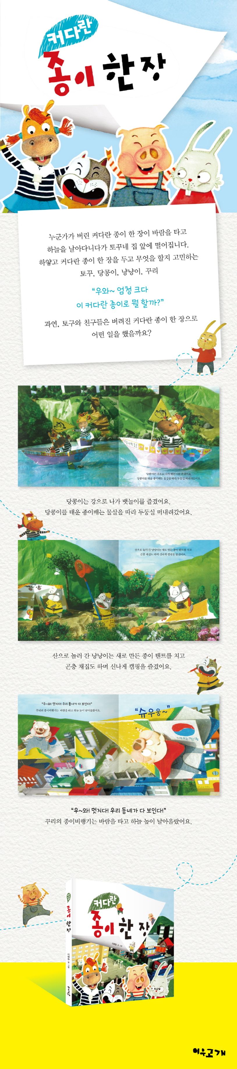 종이 한 장으로 친구들과 함께하는 놀이. 아이들이 상상력을 자유로이 발산하며 놀 수 있는 도구로 뭐가 있을까 생각하다가 가장 훌륭한 도구는 종이라는 생각이 들었습니다. 종이 한 장으로 친구들과 함께하는 놀이의 중요성과 협력을 통한 즐거움을 알아 가는 아이들의 모습을 상상하며 《커다란 종이 한 장》을 기획했습니다. 이 책의 이야기는 ‘내 키보다 더 큰 종이 한 장이 생긴다면 무엇을 할 수 있을까?’라는 질문으로 시작됩니다. 토꾸와 친구들이 협력하는 모습을 통해 우리 아이들도 진정한 공동체의 일원으로서 성장해 나가기를 바랍니다.