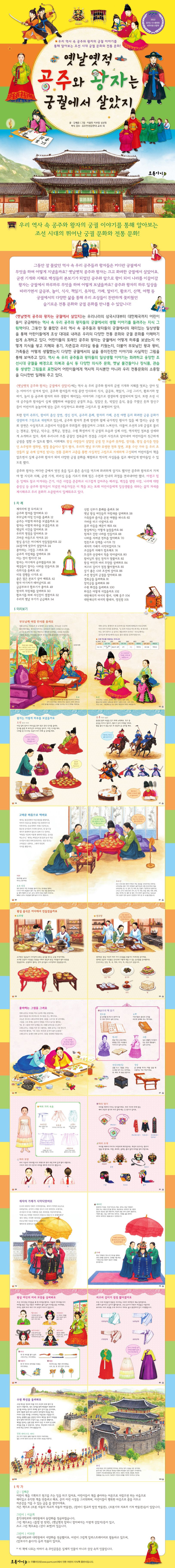 〈옛날옛적 공주와 왕자는 궁궐에서 살았지〉는 우리나라의 삼국시대부터 대한제국까지 어린이들이 궁금해하는 역사 속 우리 공주와 왕자들의 궁궐에서의 생활 이야기를 들려주는 지식 그림책이다. 그동안 잘 몰랐던 우리 역사 속 공주들과 왕자들의 궁궐에서의 재미있는 일상생활을 통해 어린이들에게 조상 대대로 내려온 우리의 다양한 전통 문화와 궁궐 문화를 이해하기 쉽게 소개하고 있다. 어린이들의 또래인 공주와 왕자는 궁궐에서 어떻게 하루를 보냈는지 어떻게 지식을 쌓고 지혜와 용기, 자존감과 리더십 등을 키웠는지, 더불어 부모님인 왕과 왕비, 가족들은 어떻게 생활했는지 다양한 궁궐에서의 삶을 흥미진진한 이야기와 사실적인 그림을 통해 보여주고 있다. 역사 속 우리 공주들과 왕자들의 일상생활 이야기는 화려하고 웅장한 조선시대 궁궐을 배경으로 의복과 음식 등 다양한 의식주 문화, 옛날 물건들이나 장식품, 관습 등 생생한 그림들로 표현되어 어린이들에게 역사적 지식뿐만 아니라 우리 전통문화의 소중함을 다시한번 일깨워 주고 있다.