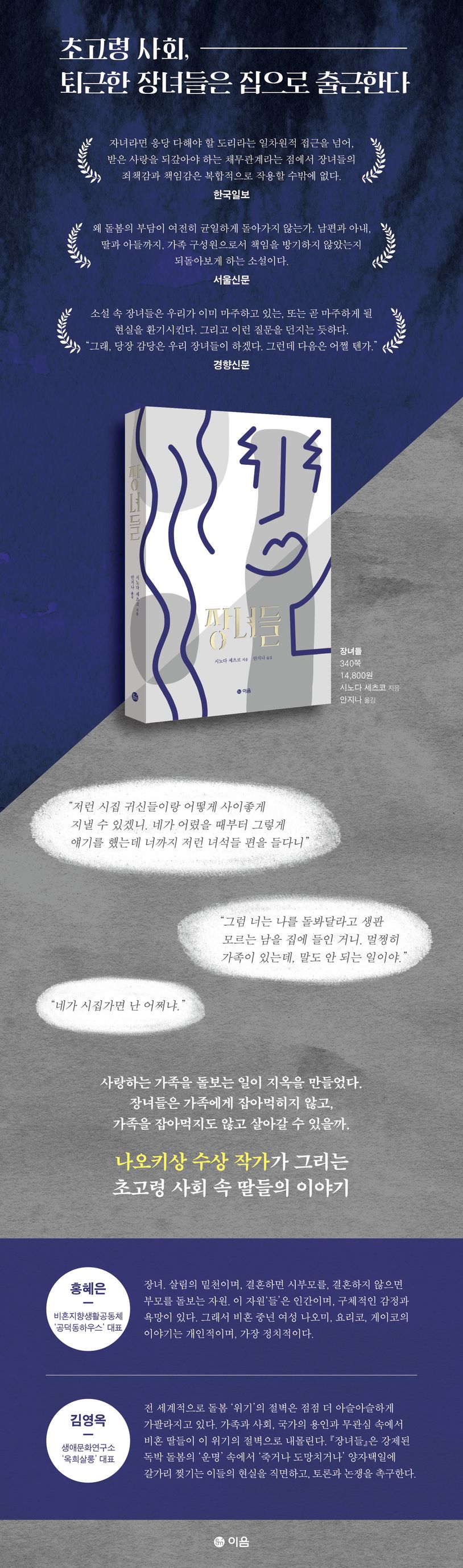 초고령 사회의 사각지대에는 노인이 된 부모를 홀로 돌보는 딸들이 있다. 딸이라는 이유로, 비혼이라는 이유로 홀로 짊어지게 된 돌봄노동은 이들을 보이지 않는 지옥으로 밀어넣는다. 『장녀들』은 이 여성들의 솔직한 목소리를 담아낸 소설로, 사랑에서 시작되었을 돌봄 이면에 자리한 서늘함을 생생하게 그려낸다. 실제로 치매에 걸린 어머니를 20년간 간병한 저자의 경험이 반영된 세 편의 이야기는 오늘날을 살아가는 딸, 특히 장녀라면 공감할 수밖에 없을 것이다.