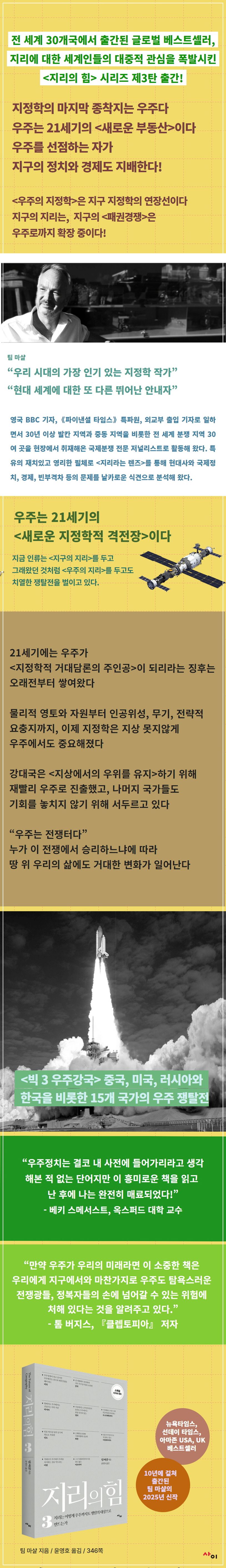우주에는주차장도있고,8천개가넘는인공위성들로붐비는인기좋은부지도있고,아프리카대륙보다조금더크지만이제는사람이거주하려고하는달도있고,최신우주선으로7개월이면갈수있는화성도있고,방사능이강한지대도있고,광활한바다도있고,개발할수있는지역도있고,군사장비를배치할수있는전략적회랑도있고,천연자원이풍부한땅도있다.이모두가강대국의관심을끌고있으며그들은어떻게해서든그곳에서우위를확보하려한다.결국우주는또다른〈쟁탈의대상〉이자새로운지정학적격전장이되었다.