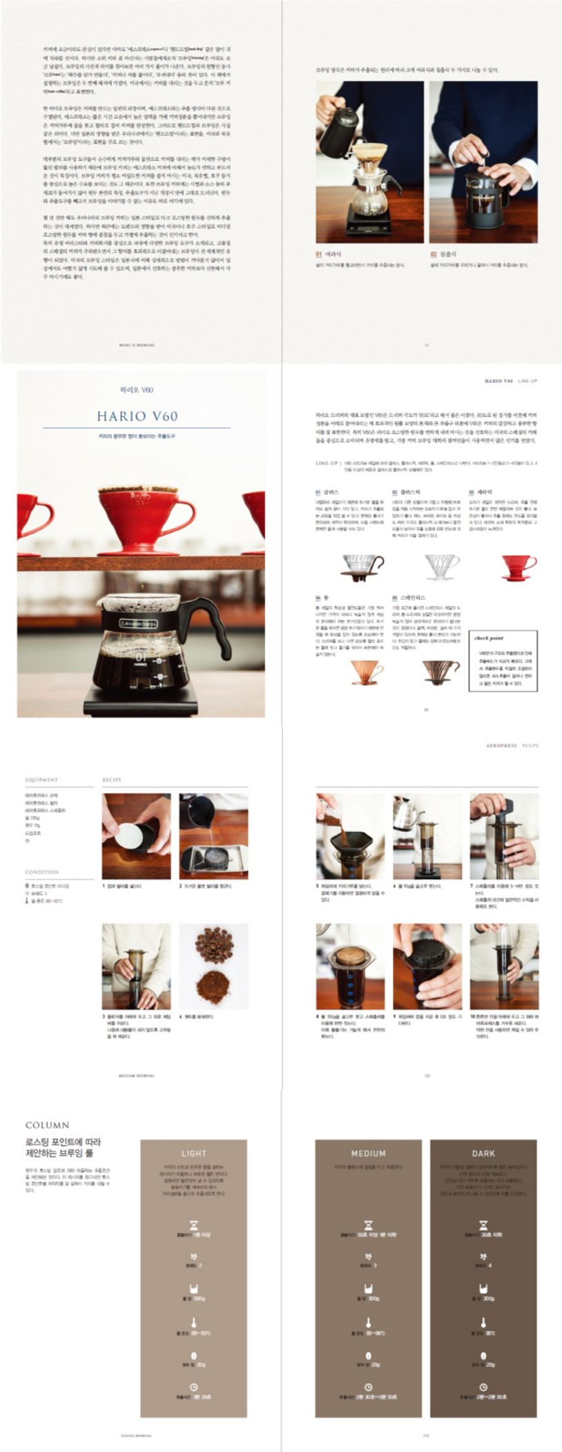 『커피 브루잉』은 브루잉을 충분히 즐길 수 있게 본격적인 브루잉을 시작하기에 앞서 알아두면 좋을 기초 지식을 함께 다루고 있다. 원두의 캐릭터, 추출도구에 대한 이해, 나의 커피 취향 등 브루잉을 시작하기 전 새겨야 할 개념부터 원두 상태, 커피가루의 입자 크기, 물 온도, 추출 시간 등 커피 맛을 좌우하는 브루잉 요소까지 골고루 실었다. 여느 커피 입문서와 같은 광범위한 설명은 피하고 브루잉 실전에 필요한 핵심만 쏙쏙 골라 친절하게 설명했다.